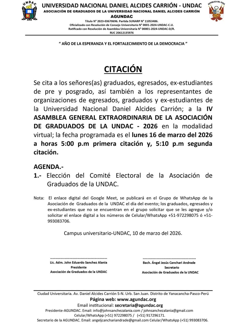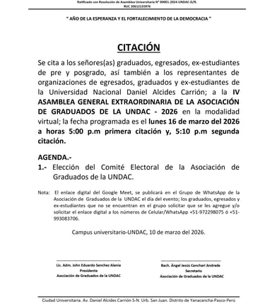 Se cita a los señores(as) graduados, egresados, ex-estudiantes de pre y posgrado, así también a los representantes de organizaciones de egresados, graduados y ex-estudiantes de la Universidad Nacional Daniel Alcides Carrión; a la IV ASAMBLEA GENERAL EXTRAORDINARIA DE LA ASOCIACIÓN DE GRADUADOS DE LA UNDAC - 2026 en la modalidad virtual; la fecha programada es el lunes 16 de marzo del 2026 a horas 5:00 p.m primera citación y, 5:10 p.m segunda citación.